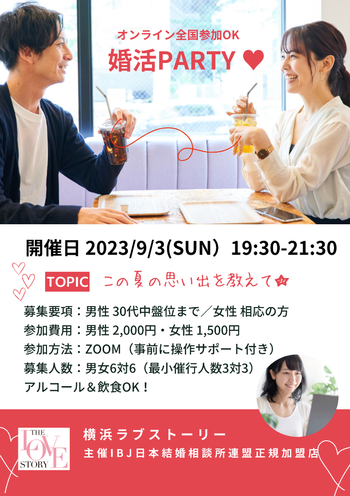 猛暑続きで皆さま疲れが出ていないでしょうか。会員様からは「真夏のお見合いはなかなか大変です笑」というお声もちらほら頂き、普段はお見合い対面派の方も、この時期はオンラインに切り替えることも。暑いのが苦手な方は、まずは自宅から気軽に出会いの場に参加してみてはいかがでしょうか?9月前半の婚活パーティーは横浜ラブストーリーと渋谷ラブストーリー。どちらもオンライン(Zoom)での開催なので、ご自宅から気軽に出会えます♪