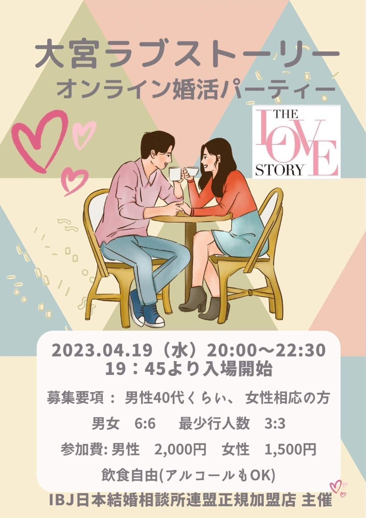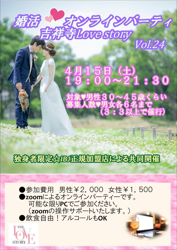 4月後半の婚活パーティーは吉祥寺ラブストーリーと大宮ラブストーリー。どちらもオンラインでの開催なので、ご自宅から気軽にご参加いただけます♪