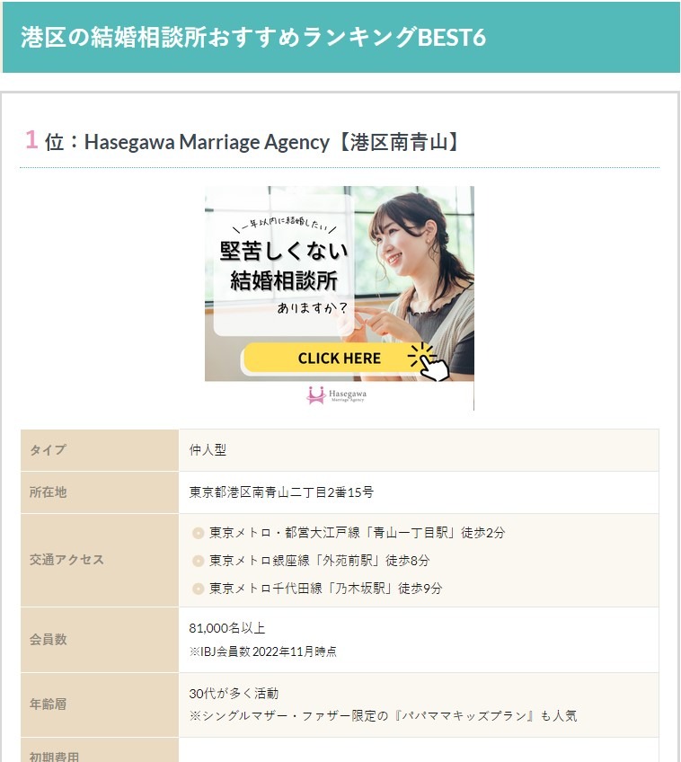 東京23区にある結婚相談所をランキング形式で紹介している【東京の結婚相談所おすすめ人気ランキングBEST10】に、東京都港区のおすすめの結婚相談所としてHasegawa Marriage Agencyが掲載されました。