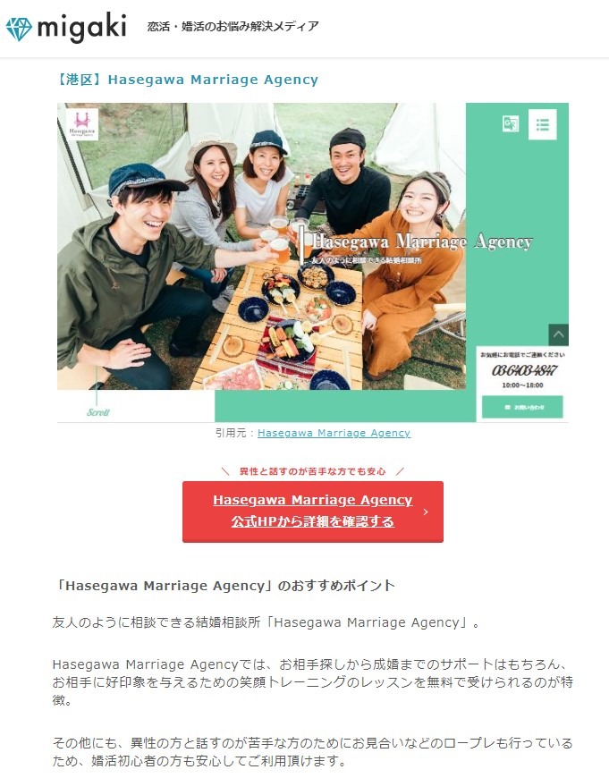恋活・婚活のお悩み解決メディア【migaki】に東京都港区でおすすめの結婚相談所として、Hasegawa Marriage Agencyが掲載されました!