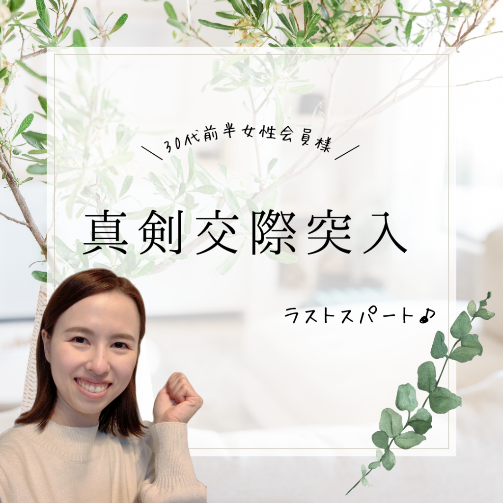 お相手の男性とは2月末に出会い、そこから毎週デートを重ね、信頼感と好きの気持ちを深めていきました。3回目デート後の振り返りのタイミングで「真剣交際に入りたい」と双方からご連絡があり、お見合いから1ヵ月で真剣交際に入られたお二人。お互いに対するお気持ちはバッチリ!ですが、結婚に向けて話し合う重要ポイントがありますので、引き続き気を引き締めてサポートをしてまいります!!