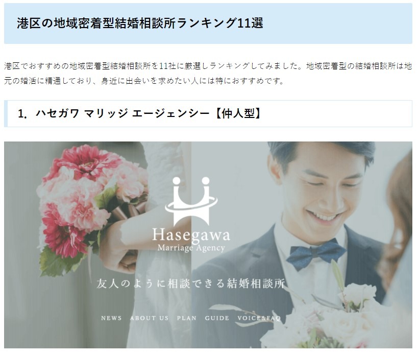 結婚するための婚活サービス比較・ランキングサイト【SUCMA】において、「東京都港区でおすすめの結婚相談所」としてHasegawa Marriage Agencyが掲載されました。