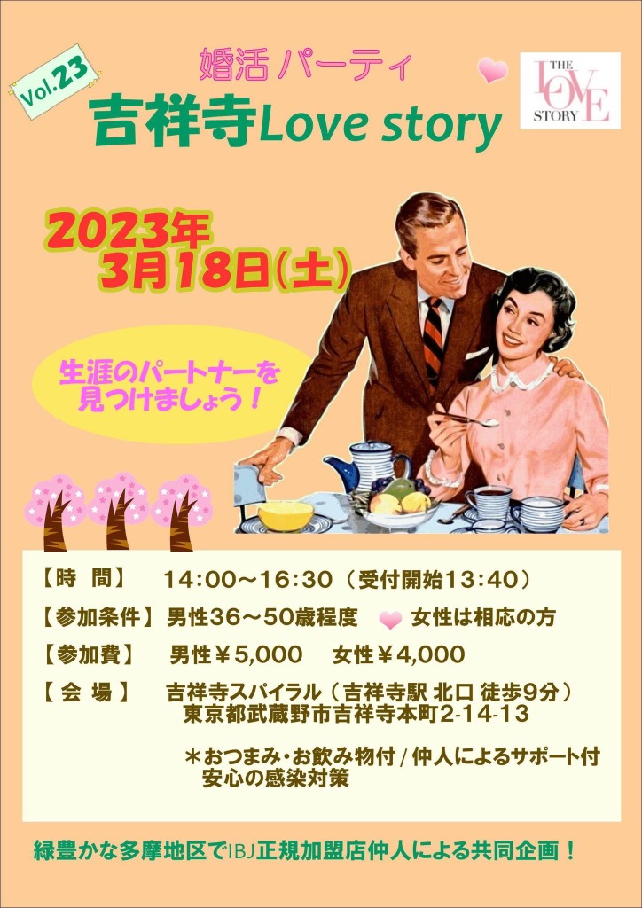 3月後半は婚活パーティー・吉祥寺ラブストーリー&大宮ラブストーリーをリアルとオンラインで開催!長谷川も一緒に参加しますので、相談もできますよ♪