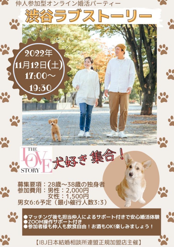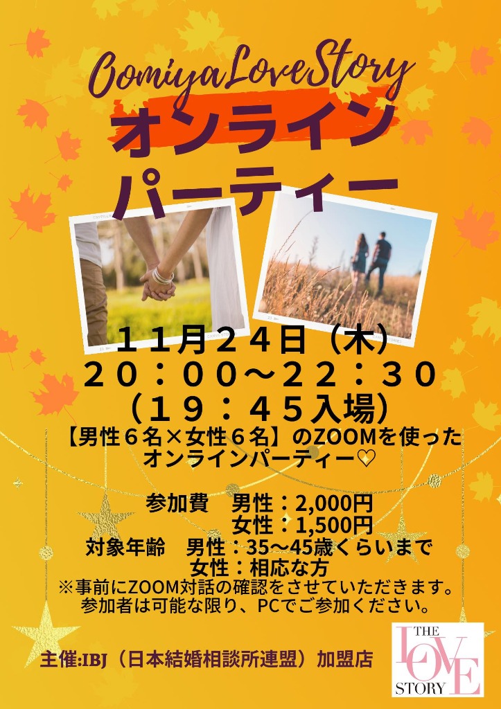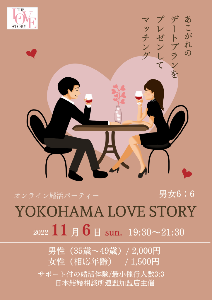 IBJ(日本結婚相談所連盟)正規加盟店の仲人が開催する『本気で結婚したい人向けの』婚活パーティー、「ラブストーリー」を今月も開催いたします!11月前半は横浜ラブストーリー&渋谷ラブストーリー♪どちらもオンラインでの開催です。