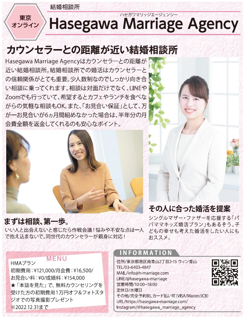 BAILA 2022.12月号の『大人女子の幸せを築き上げる♡ライフサポートLIST2022』に、BAILAおすすめの結婚相談所としてHasegawa Marriage Agencyが掲載されました!こちらの企画では、仕事を頑張りながら、自分らしくいられる⼥性を⽬指すBAILA読者様の⼤切なライフプランをサポートしてくれるサロンやスポットが厳選して紹介されています。
