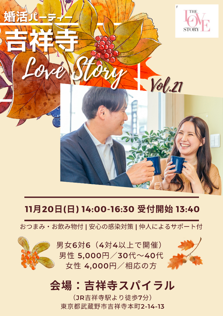 IBJ(日本結婚相談所連盟)正規加盟店の仲人が開催する『本気で結婚したい人向けの』婚活パーティー、「ラブストーリー」を今月も開催いたします!11月後半は吉祥寺ラブストーリー&大宮ラブストーリー♪吉祥寺ラブストーリーはリアルで、大宮ラブストーリーはオンラインでの開催です。
