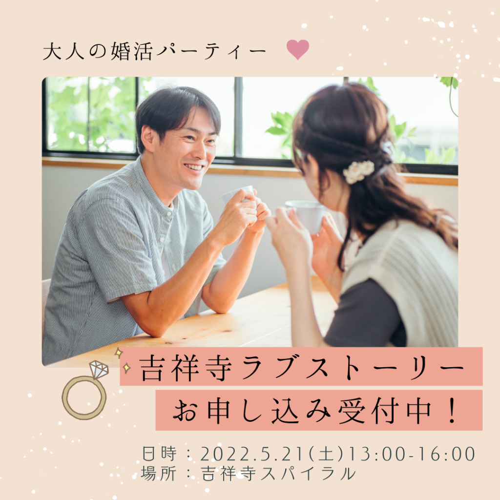 IBJ(日本結婚相談所連盟)正規加盟店のプロ仲人が開催する婚活パーティー『吉祥寺Love Story(吉祥寺ラブストーリー)』を5月も開催いたします!コロナ禍でオンライン開催が続いておりましたが、今回は対面での実施♪主催する仲人たちも気合いが入っております!「お見合いだと少し堅苦しいから、婚活パーティーで複数名と会いたい」という方や、「吉祥寺近辺で落ち着いて話せる婚活パーティーを探している」方に最適です。