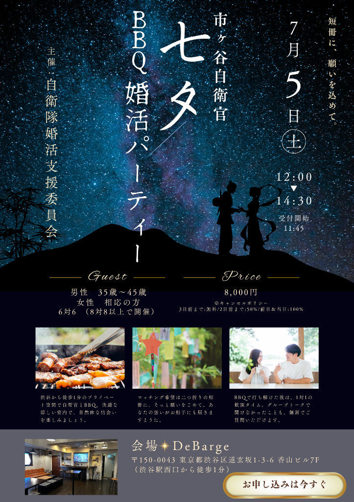 次回は7/5に市ヶ谷自衛官BBQ婚活パーティーを渋谷で開催いたします。