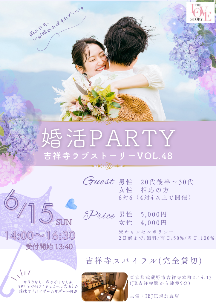6月15日に吉祥寺で行われる婚活パーティーのお知らせです。梅雨の季節でも心が晴れになるような出会いをしてみませんか?