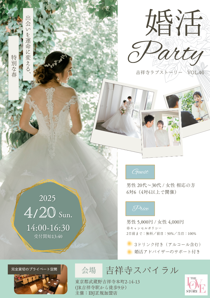 大人気の婚活パーティー「吉祥寺ラブストーリー(吉ラブ)」を4月も吉祥寺でリアルで開催いたします!
